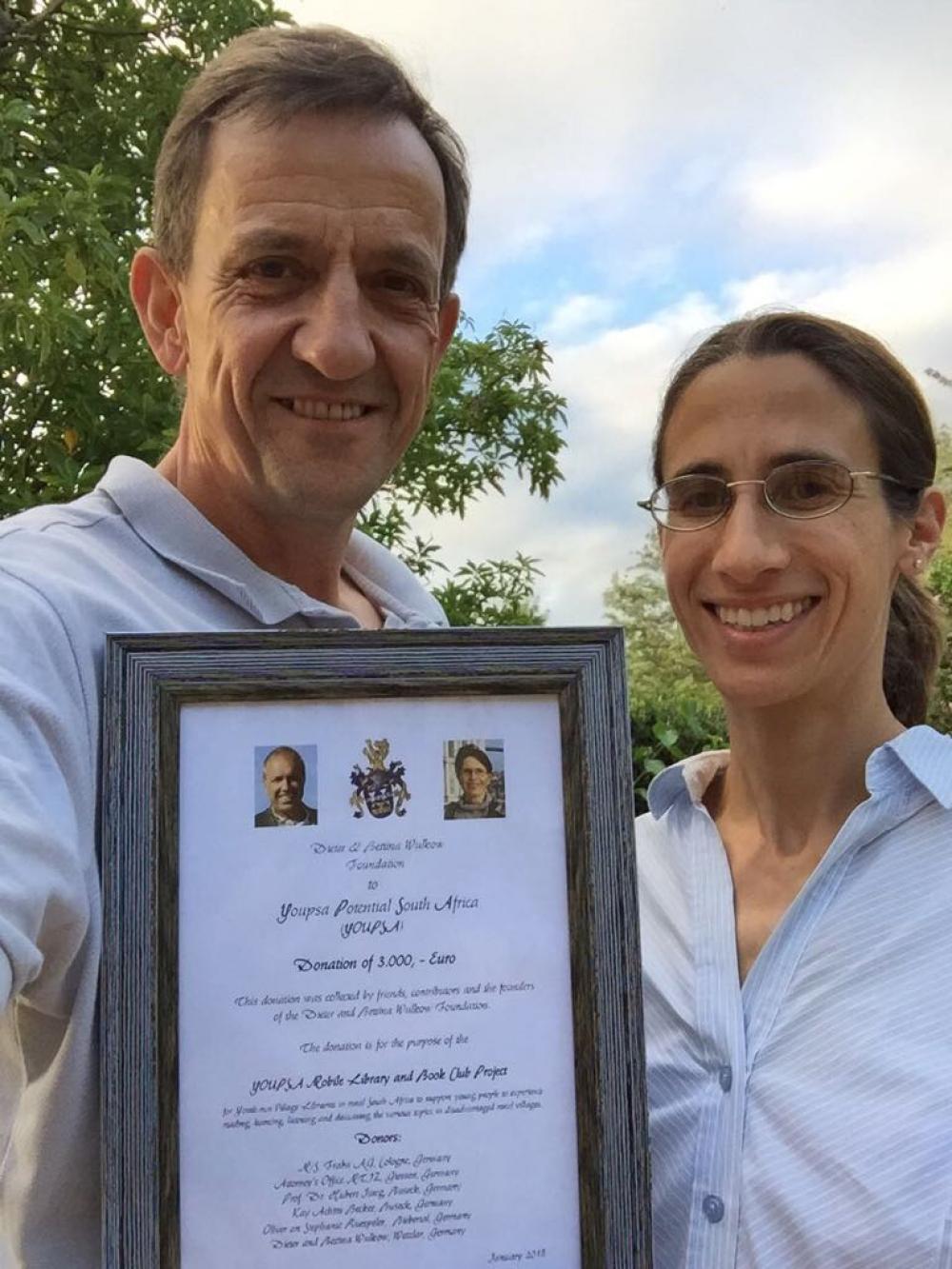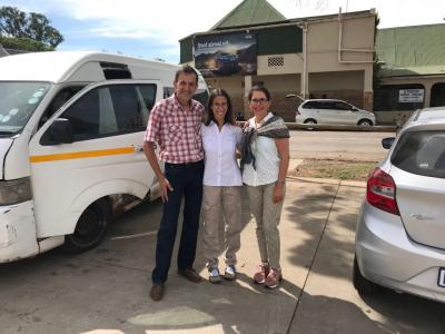 [In der Mitte Ms. Alexis Salaman von YOUPSA mit Dieter und Bettina Wulkow - Ankunft in Hankey]Wir haben heute die Organisation Youth Potential South Africa (YOUPSA) in Hankey im Eastern Cape -Südafrika besucht und unsere symbolische Spende mit unserem Spendenzertifikat an die beiden Leiter der Organisation, Ray Schöne und Alexis Salaman, überreicht. Wir durften einen ganzen Tag die Beiden bei Ihrer Arbeit für die Kinder und Schulen in der Hankey Region begleiten. Eins unserer diesjährigen Förderprojekte unterstützt YOUPSA im Aufbau von mobilen und festen Bücher- und Bildungsclubs und von Workshops an Schulen in den ärmsten ländlichen Gebieten im Eastern Cape.